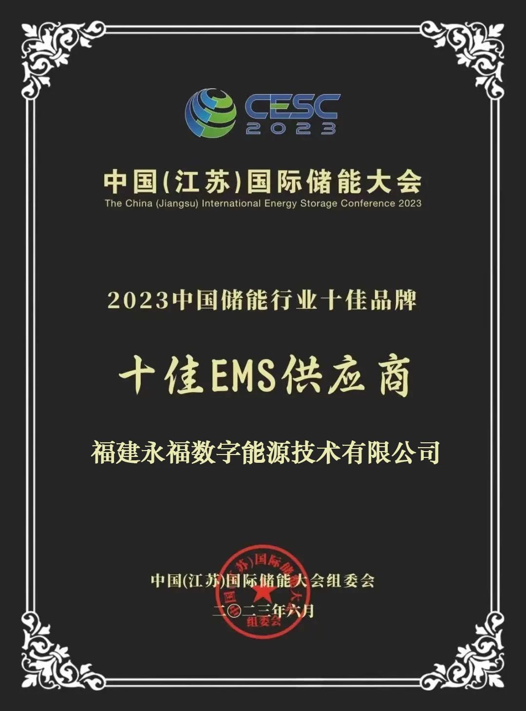 永福数能作为优质企业之一在优秀EMS供应商海选中脱颖而出,凭借高素质的团队、高质量的解决方案、优质的产品和服务,荣获“2023中国储能行业十佳EMS供应商”殊荣。该份荣誉是业内对我司在储能行业的专业能力、影响力及贡献力的多重肯定。